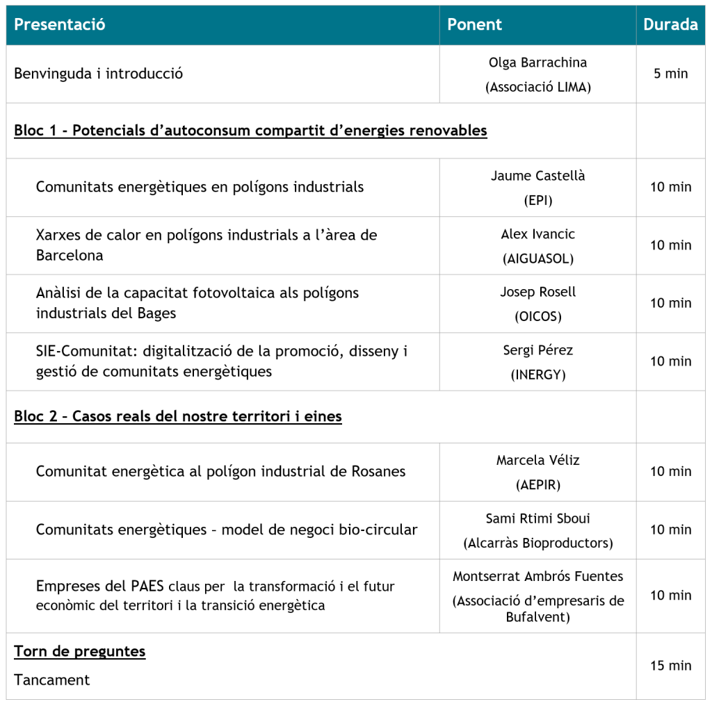 Ja tenim definida l’agenda per al webinar sobre comunitats energètiques, que tindrà lloc el dimarts 27 de febrer del 2024, a les 12h del migdia.